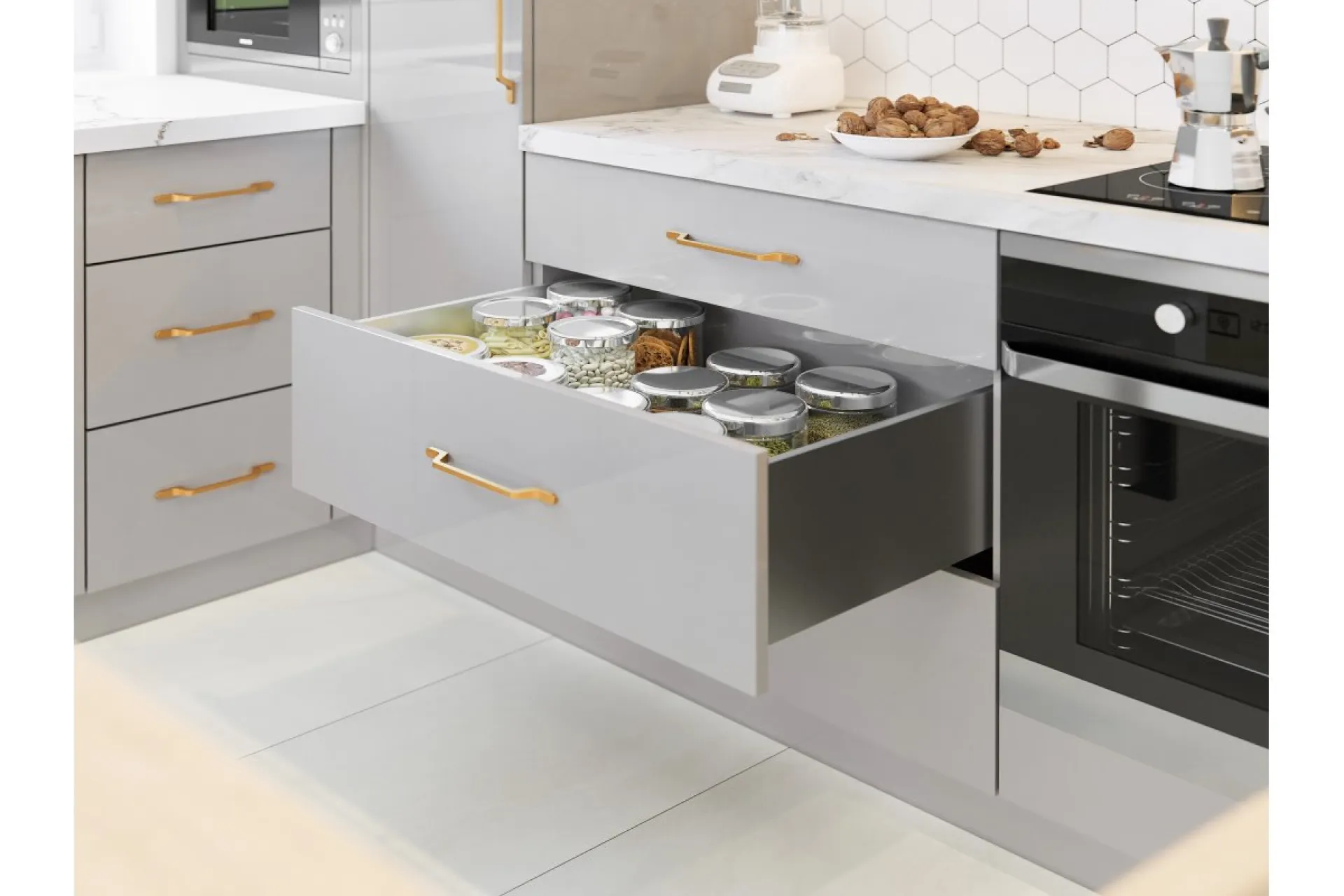 Zásuvka Axis Pro má vysokú odolnosť certifikovanú na 60 000 cyklov. Poskytuje plný výsuv v dĺžkach od 250 do 600 mm a zatvárací mechanizmus zabezpečuje tichú prevádzku a jemné dovieranie zásuvky. Vďaka piatim výškovým variantom sa dokonale prispôsobí vašej kuchyni, pričom bočná strana zásuvky so šírkou iba 14 mm umožňuje maximálne využitie vnútorného priestoru nábytku. Zásuvka unesie až 40 kg rôznych výrobkov a ponúka možnosť vnútorného výsuvu. Inštalácia je jednoduchá vďaka pohodlnému nastaveniu zvnútra, možnosti nastavenia náklonu a horizontálneho nastavenia v rozsahu ±2 mm. Zásuvka je kompatibilná s rôznymi systémami organizácie priestoru, príborovými vložkami, protišmykovými rohožami a triedičmi odpadu.