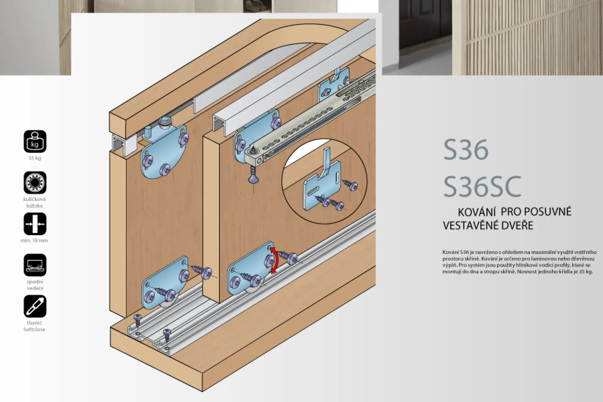 2x horný vozík, 2x spodný vozík, 1x brzda, 1x tlmič softclose, skrutky