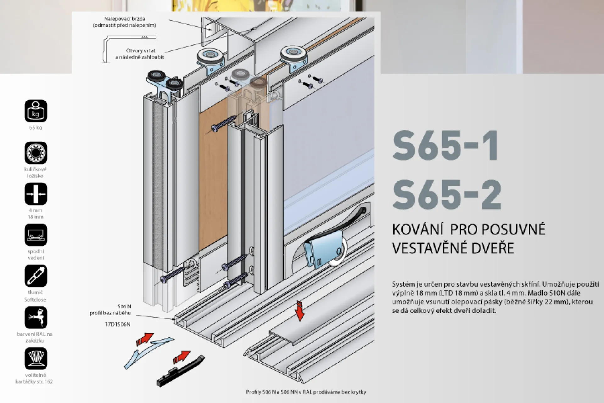 Sada vozíkov na jedny dvere. Vhodné na rámový systém S65 k madlám S10N a S11N.
