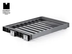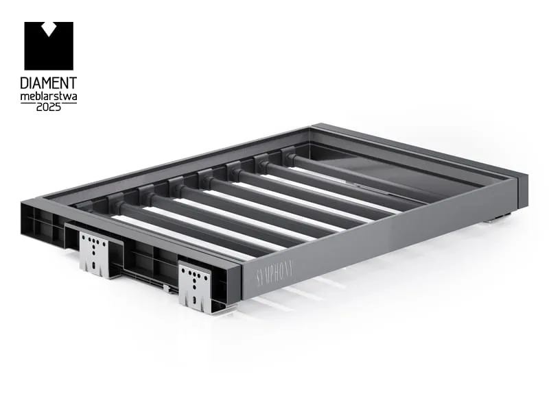 Vešiak na nohavice zo série SYMPHONY je vybavený systémom plného výsuvu, ktorý umožňuje jeho úplné vysunutie. Vďaka tomu získate ľahký prístup ku všetkým uloženým veciam, aj tým umiestneným úplne vzadu. Plný výsuv zaručuje plynulú a stabilnú prevádzku, čo zvyšuje komfort používania a uľahčuje organizáciu priestoru.