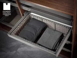 Ratanový kôš je vybavený systémom plného výsuvu, ktorý umožňuje úplné vysunutie koša zo skrine alebo šatníka. Tým získate ľahký prístup ku všetkým uloženým veciam, aj k tým na samom konci koša. Systém plného výsuvu zabezpečuje plynulý a stabilný chod, čo zvyšuje komfort používania a uľahčuje organizáciu priestoru.